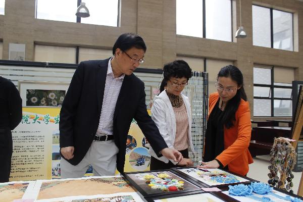 在展板前,校团委书记成瑶介绍了我校2014年暑期“三下乡”社会实践的基本情况和全校33支实践队的实践成果概况。幼儿师范学院“指尖上的关中”实践队指导老师王晶向领导们热情地介绍了这支队伍的实践过程,对学生们的作品进行了详细的讲解。