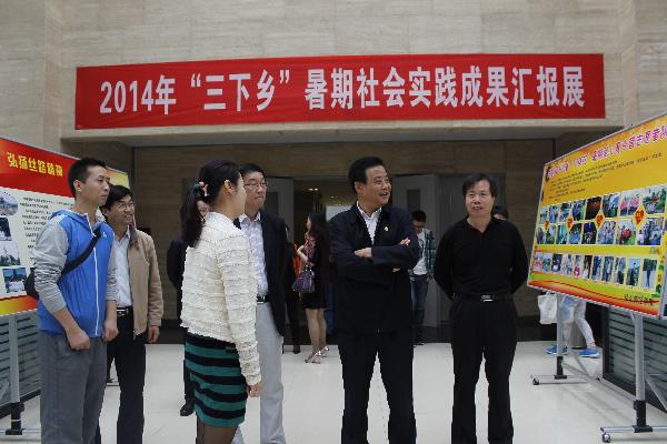 10月8日上午,校党委书记雷英杰、校长徐可为、副校长韩权、校务委员郭瑞在党政办、宣传部、学生处和团委等部门负责人的陪同下,在明德楼大厅参观了“实践归来话成果”—西安文理学院2014年暑期‘三下乡’社会实践成果展。